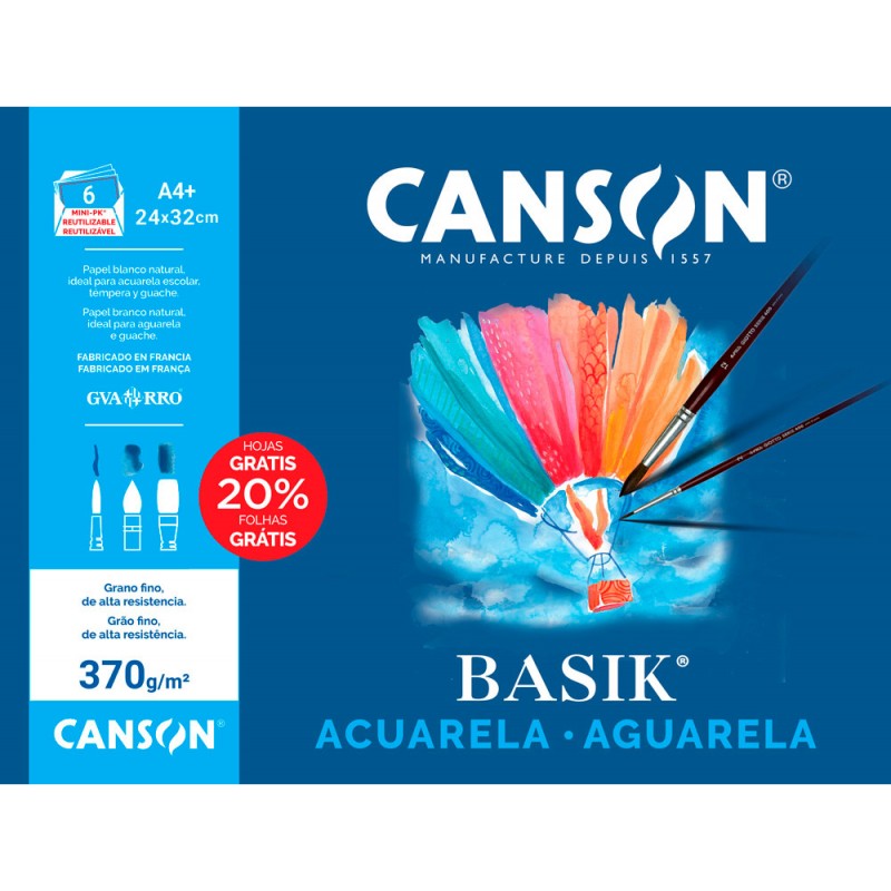 370 g/m². Papel de color blanco natural, ligeramente alisado y muy bien encolado. Ofrece dureza y regularidad en su superficie. Papel idóneo para acuarela escolar y témpera ya que permite una adecuada superposición y fijación de los colores y no desprende pelusilla por el uso del pincel. El minipack de 6 hojas.
