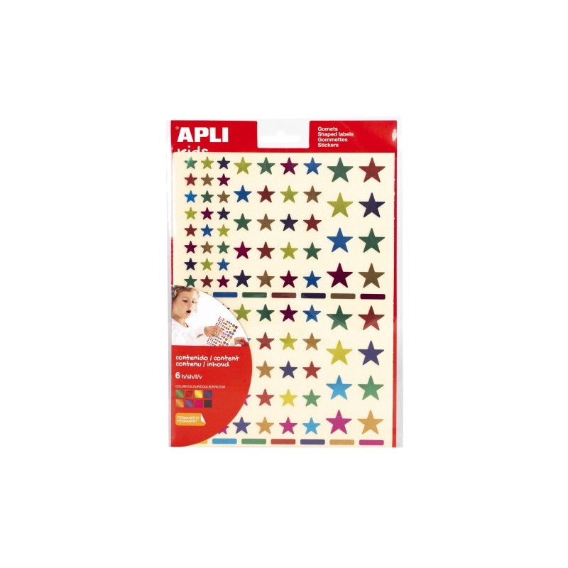 APLI 18396. Forma: Estrella, Tipo de adhesivo: Permanente, Certificación: EN-71. Hojas de medios por paquete: 6 hojas. Cantidad por paquete: 5 pieza(s)