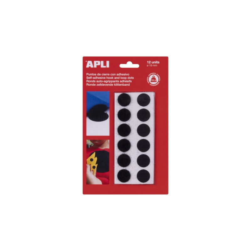 12 puntos adhesivos gancho bucle negros de Ø19 mm. Puntos de cierre por filamentos también conocido en el mercado como cierre tipo velcro. Proporciona una unión segura entre los objetos que permite abrir y volver a sellar la unión innumerables veces sin que se pierda la fuerza de sujeción. Resistencia de cierre de hasta 10 kg. Adhesivo acrílico de gran calidad que proporciona una fuerte adhesión. Alternativa inteligente y duradera a otros métodos más tradicionales de sujeción, sin necesidad de taladrar, usar clavos o coser. Pegar los dos objetos a unir cada uno con una parte de la tira adhesiva, de manera que un objeto quede con la parte rugosa hacia fuera y el otro con la parte aterciopelada. Perfectos para sujeción de objetos pequeños o como cierre de carpetas, sobres, fundas de plástico, así como pequeñas reparaciones de costura y manualidades.