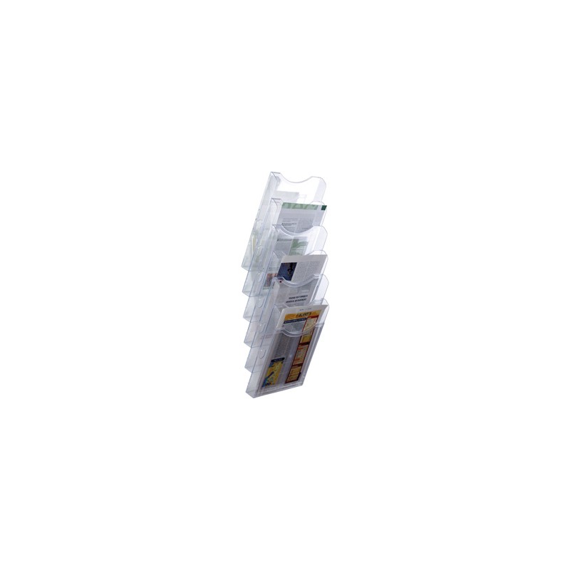 Expositor mural Archiplay Archivo 2000 con 6 compartimentos DIN A4 vertical. Medidas exteriores: 190x235x685 mm. Color cristal transparente. El conjunto sobresale de la pared 150 mm. Medidas interiores compartimentos: 27 x 234 x 300 mm. Fabricados en poliestireno transparente de gran calidad y resistencia. Se suministran completamente montados y se fijan fácilmente a la pared (kit de fijación incluido). Fabricación española.