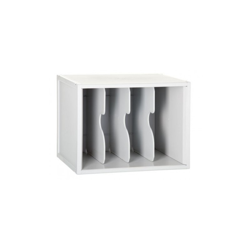 Fabricado en poliestireno muy resistente, robusto y fácil de ensamblarcon clips de sujeción incluidos.\n\nEstructura ampliable vertical y horizontalmente, con variedad de combinaciones posibles con módulos huecos, separadores verticales, carpeteros, cajones y bandejas.\n\nTodos los cajones disponen de tope de seguridady tarjetero identificador de 64 x 12 mm y el módulo carpetero de 64 x 24 mm.\n\nPosibilidad de incorporar bases metálicas con ruedas y frenopara su fácil desplazamiento.