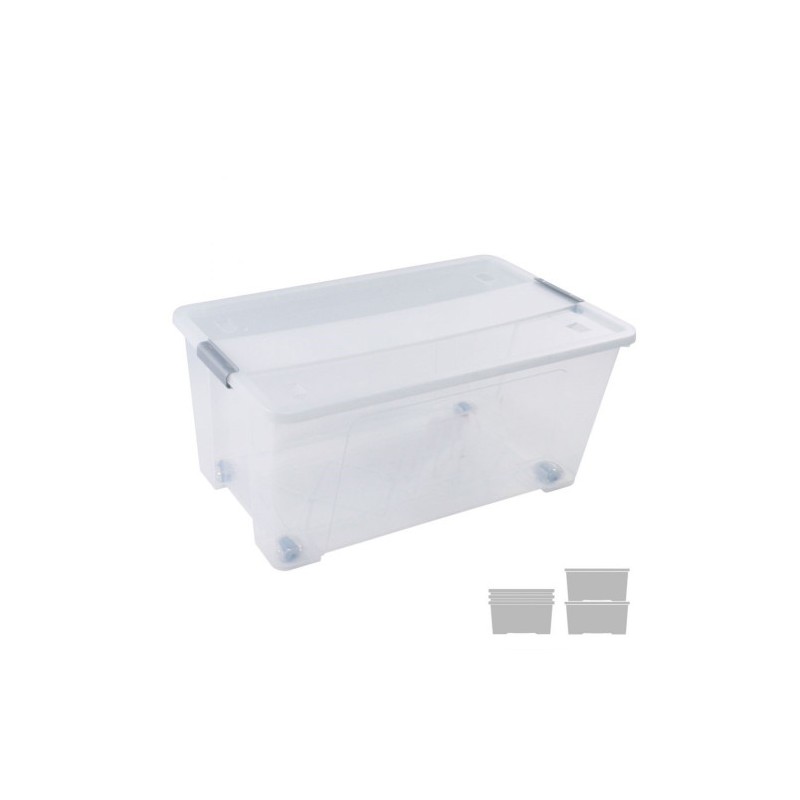 Caja de almacenaje Archivo 2000 de 61 litros de capacidad, con tapa y ruedas. Fabricada en polipropileno copolímero de gran calidad y resistencia. Sólida y reforzada para un almacenamiento perfecto. Gran protección frente al polvo y la humedad. Encajable sin tapa para optimizar el espacio y el transporte y apilable con tapa de forma estable gracias a las hendiduras en la parte superior. Las ruedas facilitan el transporte y evita posibles lesiones lumbares, se pueden sustituir por otras en caso de rotura. Color cristal transparente. Medidas exteriores: 40x68x31 cm. Fabricado en España