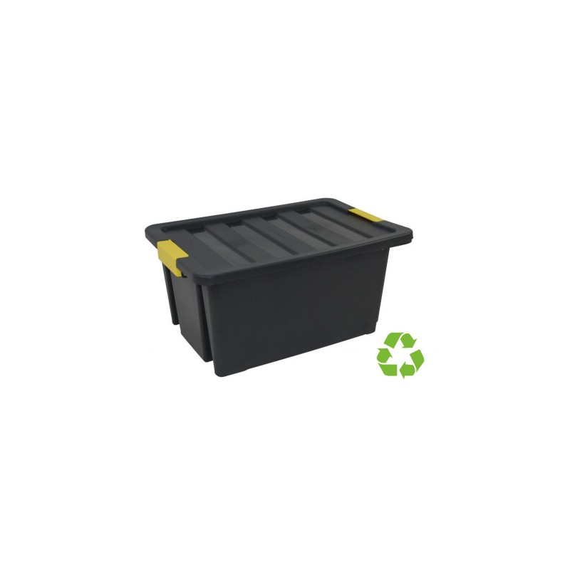 Caja de almacenaje sostenible Archivo 2000 de 55 litros de capacidad con tapa. Fabricada en polipropileno reciclado y 100% reciclable negro. Sólida y reforzada para un almacenamiento perfecto. Gran protección frente al polvo y la humedad. Sistema de bloqueo para evitar que la tapa se separe de la base. Encajable sin tapa para optimizar el espacio y el transporte y apilable con tapa de forma estable gracias a las hendiduras en la parte superior. Color negro. Medidas exteriores: 43x63x30 cm. Fabricado en España
