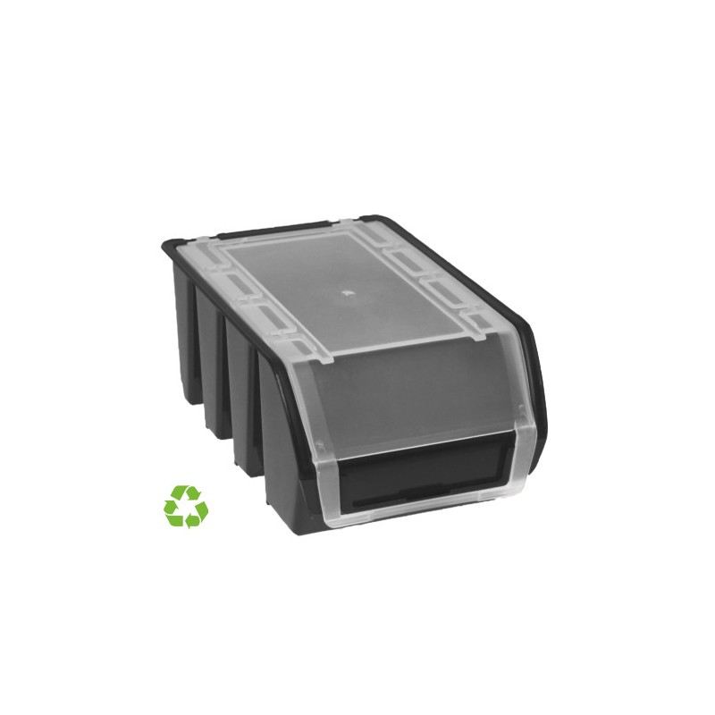 Gaveta sostenible Archivo 2000 de 0,9 litros de capacidad con tapa. Fabricadas en polipropileno reciclado y 100% reciclable negro. Muy robustas y resistentes a muchos tipos de ácidos, grasas, compuestos químicos y temperaturas extremas. Apilamiento perfecto con y sin tapa, gran estabilidad gracias a sus hendiduras laterales que permite colgar en rieles y desplazar cómodamente. Encajables para optimizar su almacenamiento y transporte. Con amplia apertura frontal que permite acceder al material cómodamente. Contienen portaetiquetas en el frontal y bordes reforzados. Ideal para almacenes, bricolaje, farmacias, industria de la moda y talleres d con tapa. Color negro. Medidas exteriores: 16x11,5x7,5 cm. Fabricado en España
