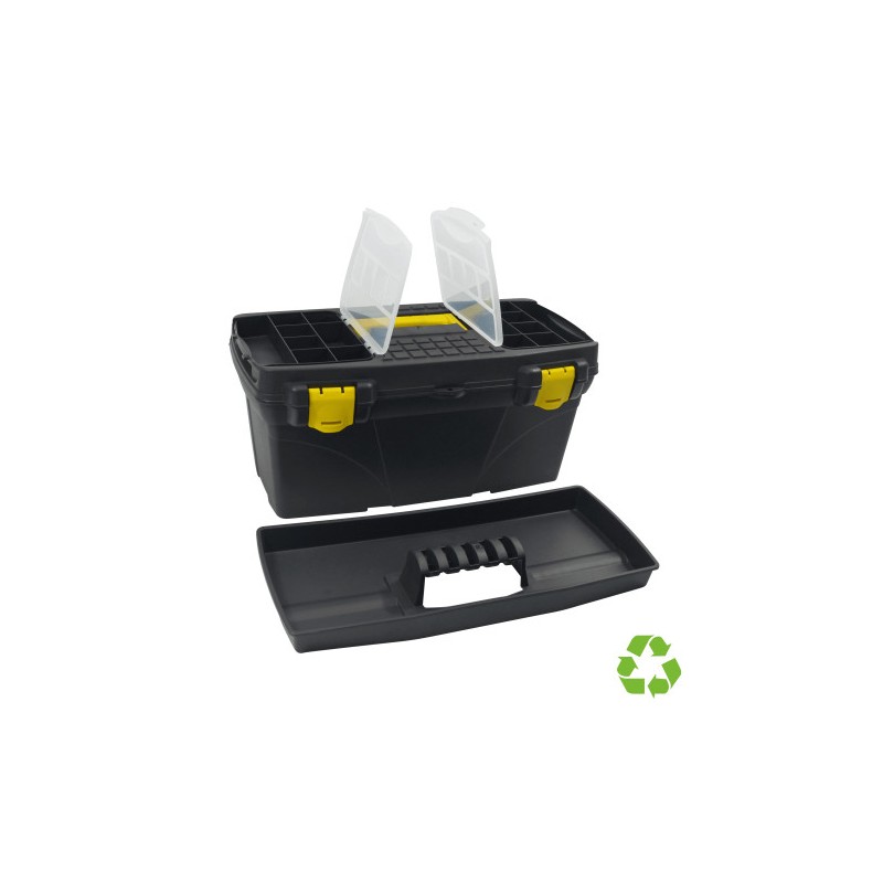 Caja de herramientas sostenible . Formato S. Con bandeja organizadora y varios compartimentos. Fabricado en polipropileno reciclado y 100% reciclable negro, muy resistente y robusto. Los compartimentos exteriores con tapas transparentes permiten tener los pequeños materiales organizados y facilitan el trabajo del día a día. Con bandeja organizadora extraíble para herramientas. Es muy ligera, lo que facilita su movilidad. Ideal tanto para el lugar de trabajo como para el hogar. Color negro. Medidas exteriores: 19x39x18 cm. Fabricado en España