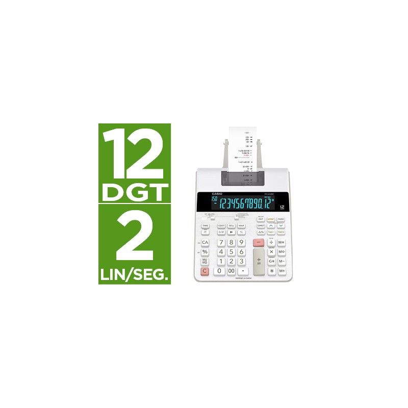 Calculadora impresora con pantalla de 12 dígitos. Utiliza rollo de papel de 58 mm de ancho. Impresión bicolor IR-40T. Cálculo de ganancias. Cálculo de impuestos. Tecla de corrección rápida. Tecla de doble cero. Incluye adaptador. Color blanco. Medidas: 195 x 313 x 65 mm. Peso: 620 g.