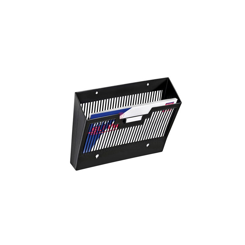 Expositor de rejilla de gran capacidad para documentos Din A4 y folio. Acoplable en vertical. Con portaetiquetas central. Apertura ancha para fácil acceso. Equipado con un soporte de etiqueta central, para poder unir las cestas en grupos o por separado. Fabricado en poliestireno reciclable de alto impacto. Color negro. Medidas: 25,7 x 9,5 x 36 cm.