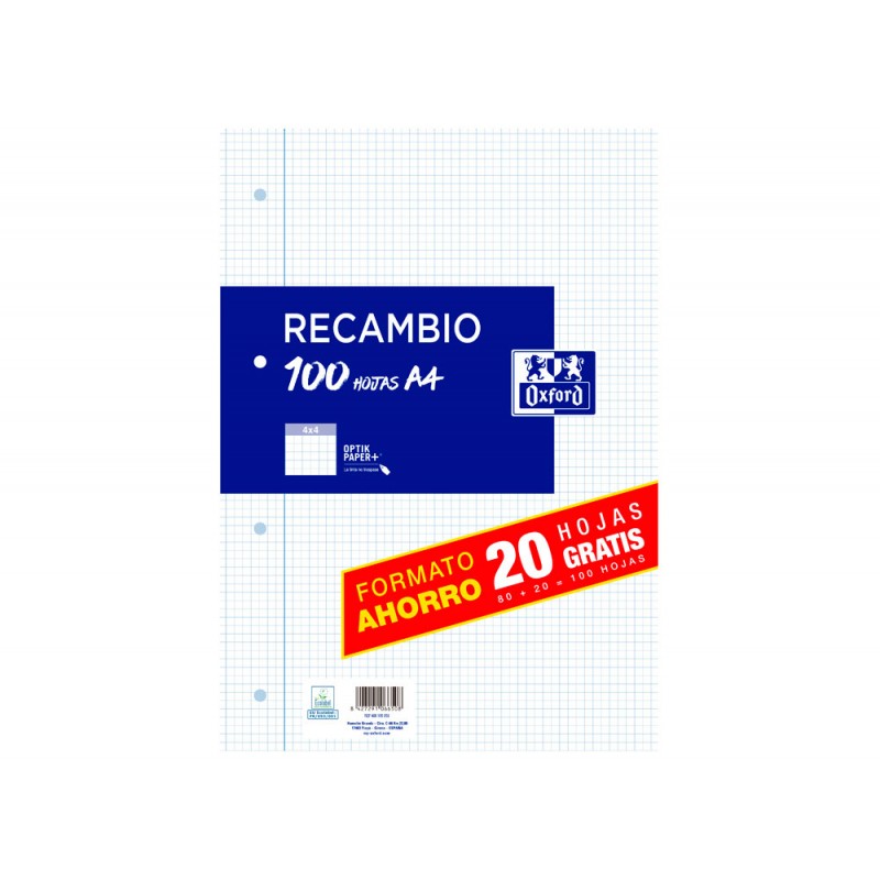 Recambio OXFORD retractilado en paquete de hojas sueltas, permite llevar contigo sólo las hojas que necesites, mover, y ordenar tus hojas con total libertad. Con 4 taladros para poder archivar las hojas cómodamente en tu Europeanbinder, Carpeta de Anillas o Archivador Palanca. Además con el papel exclusivo de Oxford OptikPaper la escritura es mucho más sencilla, el lápiz o la tinta se deslizan suavemente con facilidad, sin traspasar a la otra cara de la hoja. Cuadrícula 4x4 con margen izquierdo. Disponible en varios formatos y rayados.