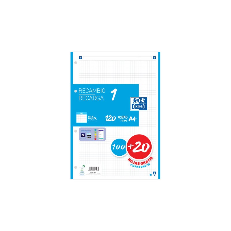 Recambio OXFORD retractilado en paquete de 100 Hojas con 1 color de banda y 4 taladros de archivo para poder guardar las hojas en un archivador o carpeta de anillas. Ideal para quienes prefieren hojas sueltas y llevar sólo las que necesiten. Compatible con la app gratuita SCRIBZEE que permite organizar, consultar, compartir y acceder a tus notas en cualquier lugar desde tu Smartphone, tablet o PC.