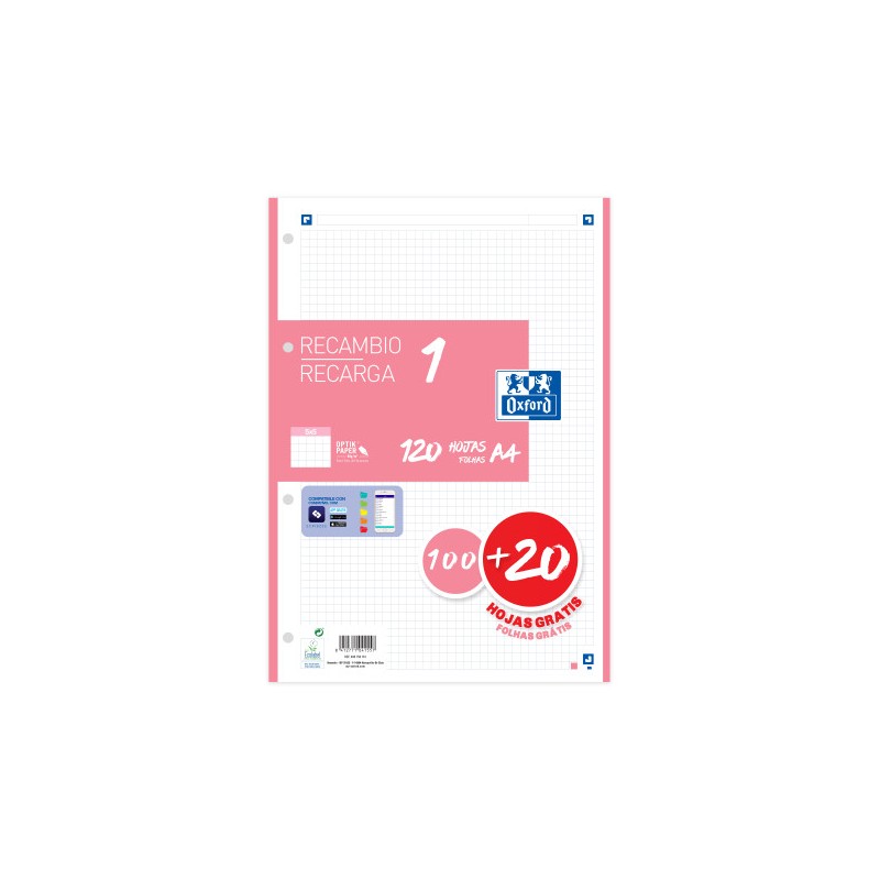 Recambio OXFORD retractilado en paquete de 100 Hojas con 1 color de banda y 4 taladros de archivo para poder guardar las hojas en un archivador o carpeta de anillas. Ideal para quienes prefieren hojas sueltas y llevar sólo las que necesiten. Compatible con la app gratuita SCRIBZEE que permite organizar, consultar, compartir y acceder a tus notas en cualquier lugar desde tu Smartphone, tablet o PC.