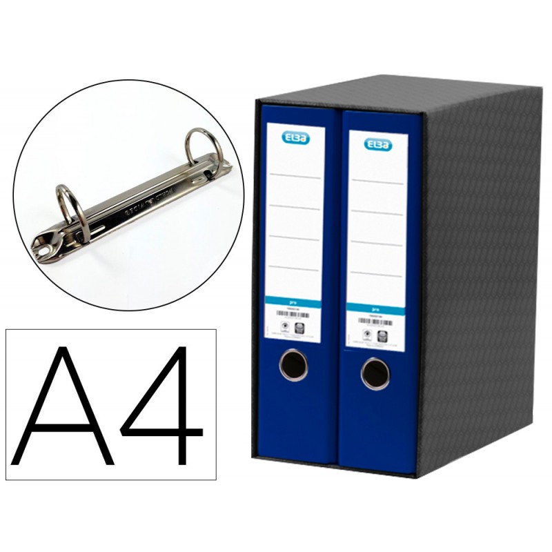 Archivadores forrados y plastificados en polipropileno con tarjetero, palanca, ollao y rado. Las cajas están fabricadas en cartón de doble microcanal barnizado y plastificado en polipropileno brillante. Dimensiones: 330x170x300mm. Incluyen cantoneras metálicas. Módulo de 2 archivadores de palanca A4 Elba Rado Top azul.