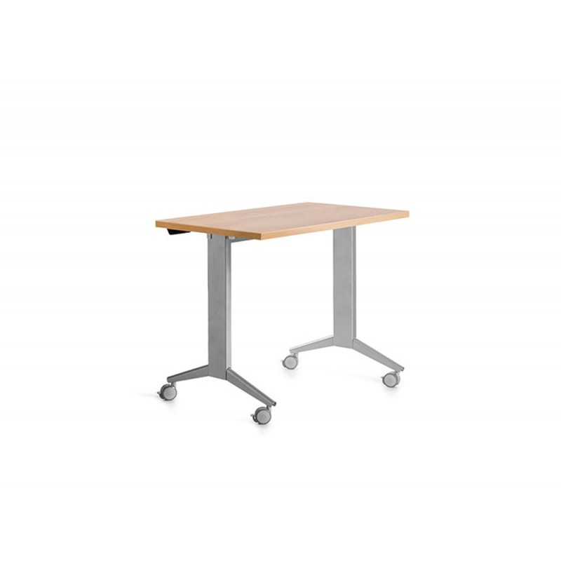 MESA CON TABLERO ABATIBLE 90°. IDEAL PARA SALAS POLIVALENTES DONDE SE NECESITA CAMBIAR CONTINUAMENTE LA DISTRIBUCIÓN DEL MOBILIARIO. TABLERO DE 25MM DE GROSOR EN COLOR ROBLE Y ESTRUCTURA FABRICADA EN ACERO COLOR GRIS. INCORPORA RUEDAS CON FRENO PARA SU DESPLAZAMIENTO. FALDÓN Y ACCESORIO DE UNIÓN ENTRE MESAS OPCIONALES. MEDIDA DE LA MESA 120X60CM.