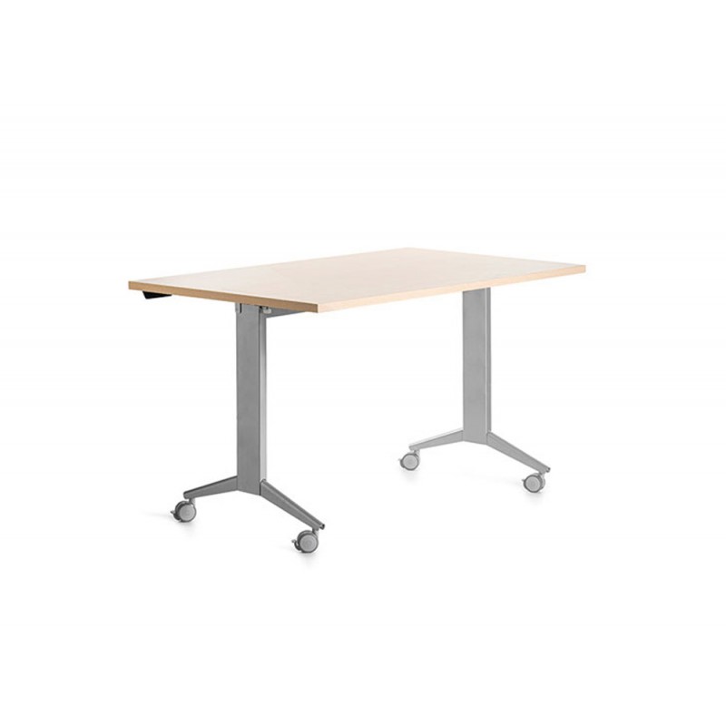 MESA CON TABLERO ABATIBLE 90°. IDEAL PARA SALAS POLIVALENTES DONDE SE NECESITA CAMBIAR CONTINUAMENTE LA DISTRIBUCIÓN DEL MOBILIARIO. TABLERO DE 25MM DE GROSOR EN COLOR HAYA Y ESTRUCTURA FABRICADA EN ACERO COLOR GRIS. INCORPORA RUEDAS CON FRENO PARA SU DESPLAZAMIENTO. FALDÓN Y ACCESORIO DE UNIÓN ENTRE MESAS OPCIONALES. MEDIDA DE LA MESA 140X80CM.