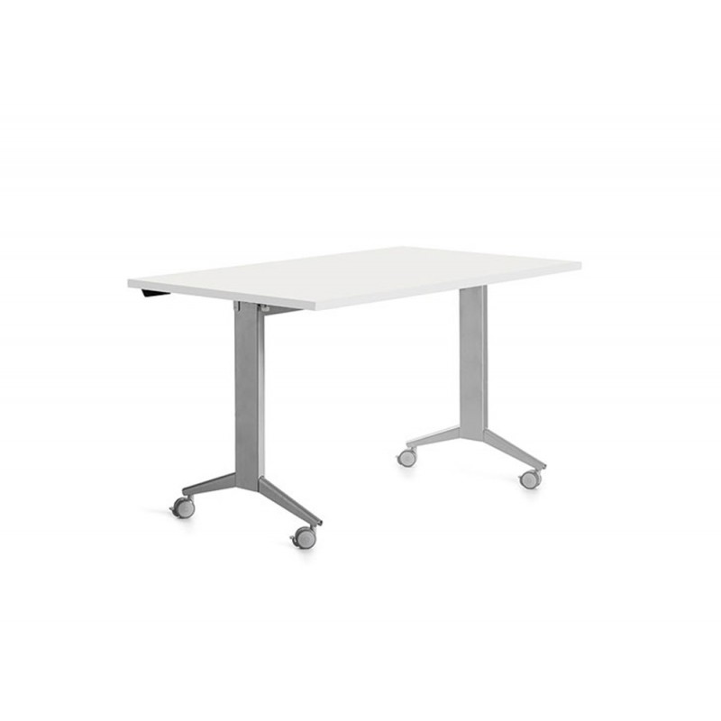 MESA CON TABLERO ABATIBLE 90°. IDEAL PARA SALAS POLIVALENTES DONDE SE NECESITA CAMBIAR CONTINUAMENTE LA DISTRIBUCIÓN DEL MOBILIARIO. TABLERO DE 25MM DE GROSOR EN COLOR BLANCO Y ESTRUCTURA FABRICADA EN ACERO COLOR GRIS. INCORPORA RUEDAS CON FRENO PARA SU DESPLAZAMIENTO. FALDÓN Y ACCESORIO DE UNIÓN ENTRE MESAS OPCIONALES. MEDIDA DE LA MESA 140X80CM.