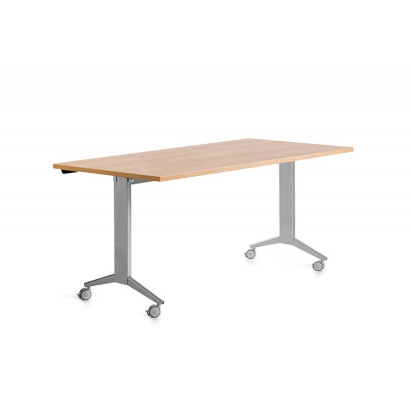 MESA CON TABLERO ABATIBLE 90°. IDEAL PARA SALAS POLIVALENTES DONDE SE NECESITA CAMBIAR CONTINUAMENTE LA DISTRIBUCIÓN DEL MOBILIARIO. TABLERO DE 25MM DE GROSOR EN COLOR ROBLE Y ESTRUCTURA FABRICADA EN ACERO COLOR GRIS. INCORPORA RUEDAS CON FRENO PARA SU DESPLAZAMIENTO. FALDÓN Y ACCESORIO DE UNIÓN ENTRE MESAS OPCIONALES. MEDIDA DE LA MESA 160X80CM.