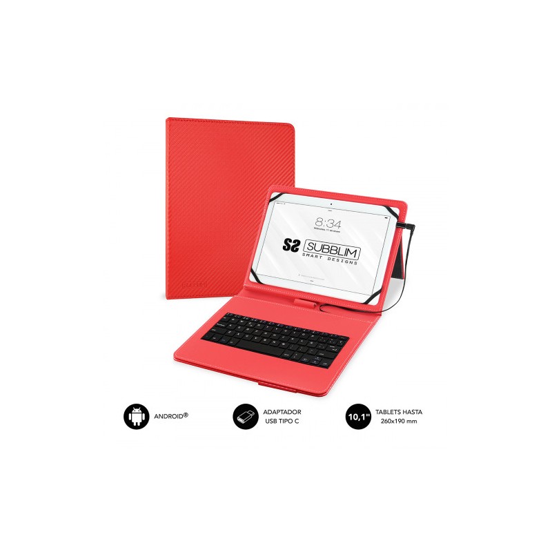 Lleva la informática móvil a otro nivel gracias a este teclado con funda universal para Tablets dotadas del sistema Android. Fija la Tablet de 9 a 10 pulgadas en un ángulo ideal para escribir o visionado de videos y se mantiene firme gracias al sistema de atril magnético que incorpora. Su cubierta duradera con acabado en símil de Fibra de Carbono es resistente a salpicaduras y protege tu Tablet durante el uso diario.Disfruta de horas de flexibilidad y comodidad al escribir gracias a teclas grandes bien espaciadas que se extienden de un extremo a otro para que tus manos tengan espacio. Proporciona la profundidad óptima para teclear con rapidez y comodidad. Las teclas de acceso directo y de función dedicadas Android permiten controlar la Tablet sin abandonar el teclado.Type C AdaptorEl teclado es compatible con la gran mayoría de Tablets con sistema Android. Para ello Incluye un adaptador de MicroUSB a Type C cubriendo los modelos de última generación.Cierre MagnéticoDisfruta de su cierre magnético que además de elegancia, ofrece una alta seguridad facilitando su transporte.Exclusivo Sistema de SujeciónTe permite fijar tu dispositivo sin dañar su pantalla o marco, gracias al exclusivo sistema de silicona muy resistente y adaptable.