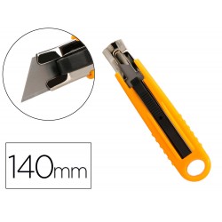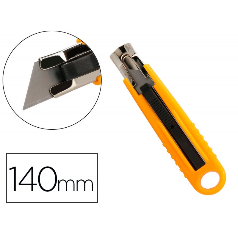 Fabricado en plástico y acero. Cuchilla retráctil de seguridad: la cuchilla solo sale al exterior cuándo se pulsa el mecanismo negro y vuelve al interior en el momento en que se deja de presionar, para así evitar que la cuchilla quede en el exterior cuándo no se esté usando. Cuchilla de acero de 18 mm de ancho. Colores surtidos: amarillo, azul y naranja. Recomendado por gran público y profesionales. Longitud: 140 mm. Blíster de 1 unidad.