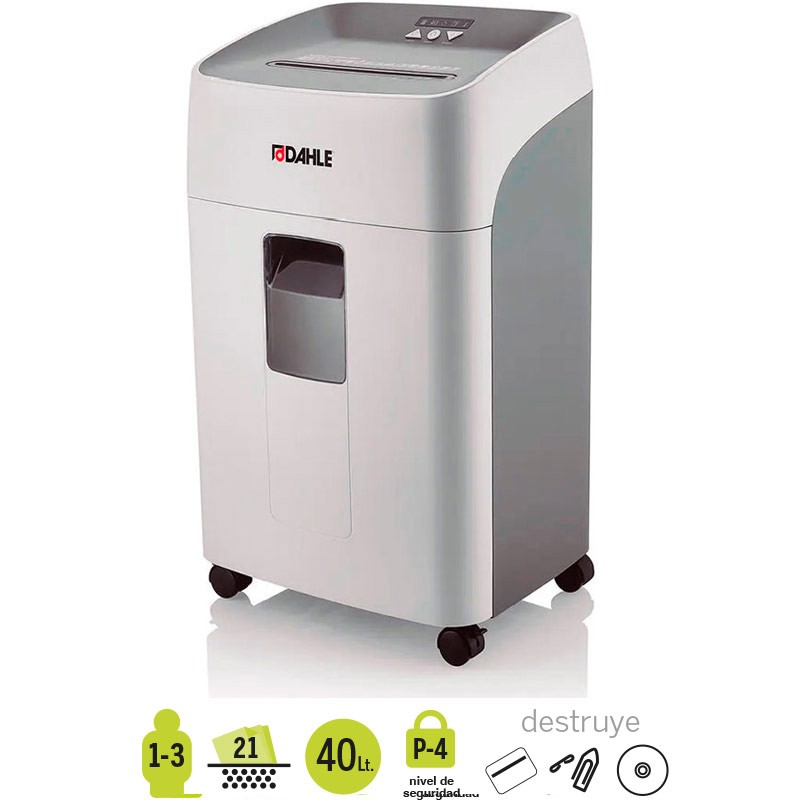 DESTRUCTORA DE DOCUMENTOS DAHLE DESKSIDE 404P USO COMPARTIDO MANUAL 21 HOJAS CICLO DE TRABAJO 210 MIN PARTICULAS P4 GRAPAS CLIPS TARJETAS Y CDS 40 LITROS
