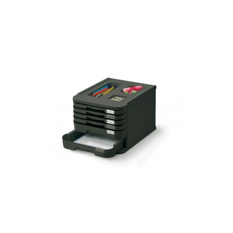 En poliestireno. Módulo con ocho cajones de 2,5 cm. para guardar documentos, con sistema de bloqueo, que evita la salida de los mismos. Con portaetiquetas en cada cajon. Diseñado para poder apilarse de forma vertical formando un sólido bloque. Con dos tapas decorativas. Medidas exteriores: 28,5×37,5×23 cm.