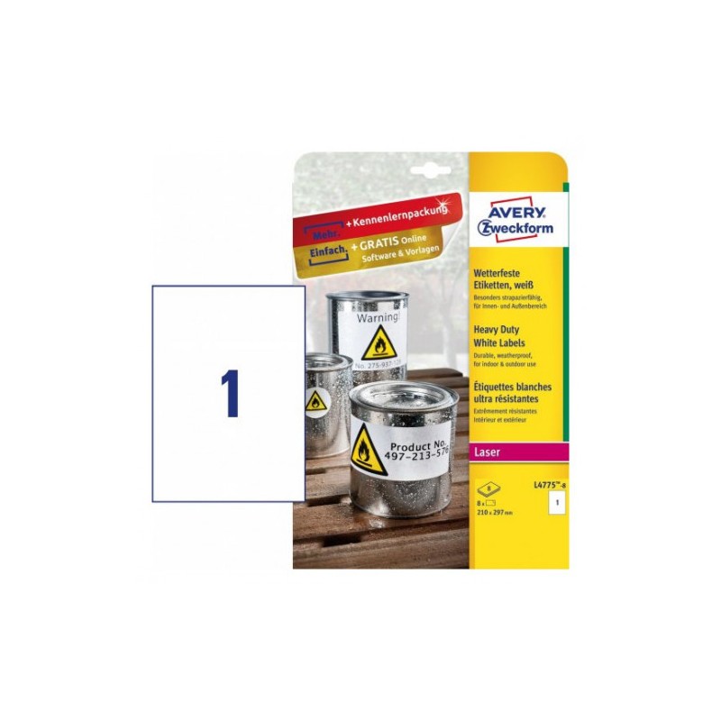 Avery L4775-8. Color del producto: Blanco, Tipo de etiqueta: Etiqueta para impresora autoadhesiva, Formato: A4. Anchura de etiqueta: 21 cm, Altura de etiqueta: 29,7 cm, Ancho de la hoja: 21 cm. Etiquetas por paquete: 8 pieza(s), Hojas de medios por paquete: 8 hojas, Etiquetas por hoja: 1 pieza(s)