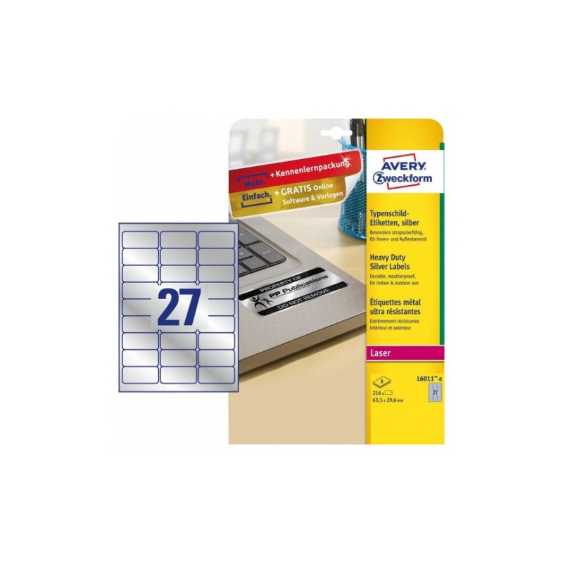 Avery L6011-8. Color del producto: Plata, Tipo de etiqueta: Etiqueta para impresora autoadhesiva, Formato: A4. Anchura de etiqueta: 6,35 cm, Altura de etiqueta: 2,96 cm, Ancho de la hoja: 21 cm. Etiquetas por paquete: 216 pieza(s), Hojas de medios por paquete: 8 hojas, Etiquetas por hoja: 27 pieza(s)