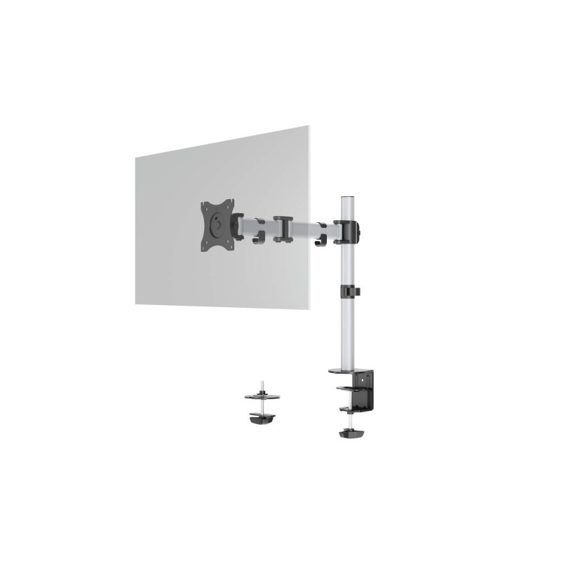Soporte y brazo articulado de monitor para 1 pantalla con opción de montaje individual mediante fijación atornillada y abrazadera de mesa. Regulable en altura, inclinación y posición del monitor. Puede girarse 360° para trabajar en modo vertical u horizontal. El brazo se puede extender de hasta 40 cm mediante tres articulaciones y girar hasta 180°. Ajuste continuo de la altura de la pantalla sobre una columna de 44 cm de altura. Soporte VESA universal (75 x 75 mm o 100 x 100 mm), para monitores estándar de hasta 27" y hasta 8 kg. Gestión de cables: El cable del monitor se guía a lo largo del soporte del monitor mediante 3 abrazaderas.