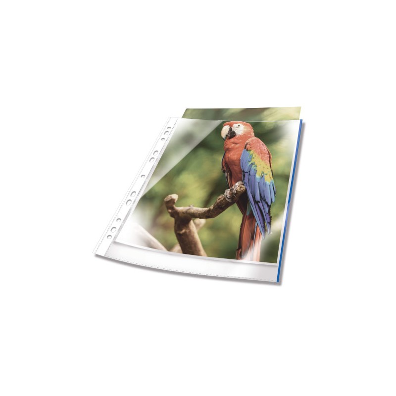 Funda multitaladro neutra para los documentos. Fabricadas en polipropileno y acabado cristal. Calidad prémium, 80 mµ. Con refuerzo en borde perforado. Perforación universal para guardar en archivadores y carpetas de anillas. Abertura superior. Formato: A4 vertical. Bolsa de 25 unidades con borde de color lateral color azul.