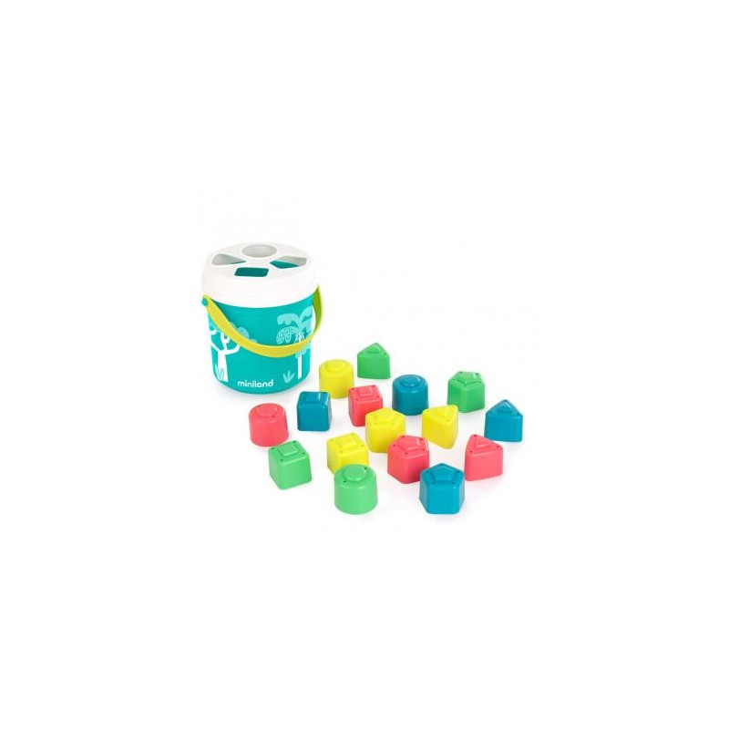 Juego de encajes que ayuda a reconocer diferentesformas y colores. Todas las piezas están fabricadas con materiales recdiclados y reciclables, lo que reduce el impacto medio ambiental. Ejercita la CoordinaciónOjo-mano y el razonamiento lógico. Las 16 piezasademás de usarse como moldes de arena, disponen deorifi cios por los que se puede hacer “lluvia” de agua.Todas las piezas se pueden guardar dentro del cubocon asa para facilitar su transporte y almacenamiento