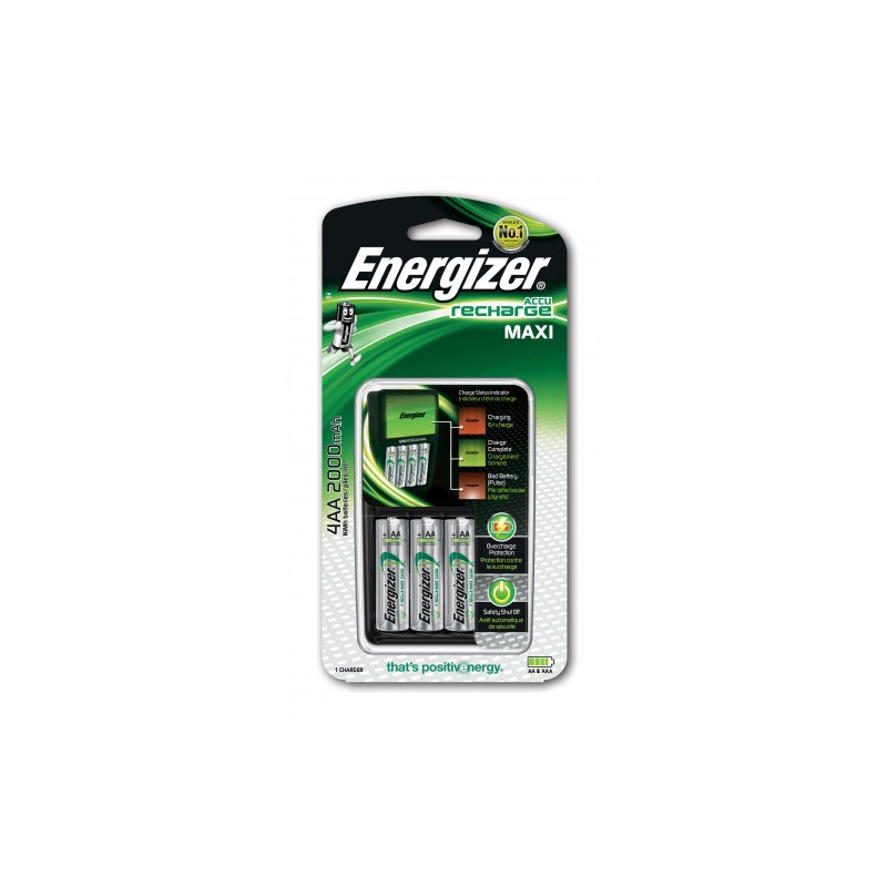 Energizer Maxi Charger. Alimentación: Corriente alterna, Tecnología de baterías compatibles: Níquel-metal hidruro (NiMH), Tamaño de baterías compatibles: AA, AAA. Color del producto: Negro, Indicadores LED: Carga. Tipo: Cargador de baterías para interior. Voltaje de entrada: 100 - 240 V, Frecuencia de entrada: 50/60 Hz, Capacidad de la batería (mín.): 0,5 Ah. Tecnología de batería: Níquel-metal hidruro (NiMH), Capacidad de batería: 2000 mAh, Número de baterías incluidas: 4 pieza(s)