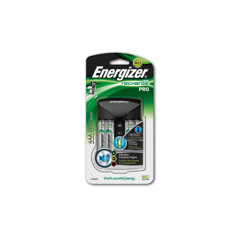 Energizer Pro Charger. Alimentación: Corriente alterna, Tecnología de baterías compatibles: Níquel-metal hidruro (NiMH), Tamaño de baterías compatibles: AA, AAA. Color del producto: Negro, Indicadores LED: Carga. Tipo: Cargador de baterías para interior. Voltaje de entrada: 100 - 240 V, Frecuencia de entrada: 50/60 Hz, Capacidad de la batería (mín.): 0,5 Ah. Tecnología de batería: Níquel-metal hidruro (NiMH), Capacidad de batería: 2000 mAh, Número de baterías incluidas: 4 pieza(s)
