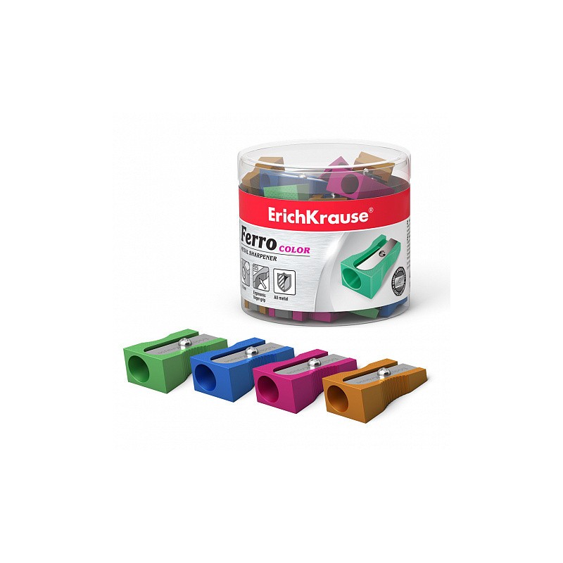 Sacapuntas metalico en colores brillantes con una zona de agarre ergonomica. Sacapuntas con un orificio de 8 mm de diametro para afilar lapices estandares de grafito negro y de color. Cuchilla niquelada de acero al carbono en forma de espiral de alta calidad.