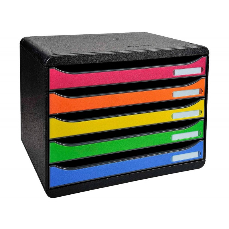 **OUTLET - Última unidad** Clasificador individual de 5 cajones para A4+. Superponible. Deslizamiento perfecto de los cajones, con un stop de seguridad y portaetiquetas con etiquetas suministradas. Color negro con cajones arlequín, cada cajón tiene un color diferente que lo hace más moderno y permite identificar con más facilidad los documentos.