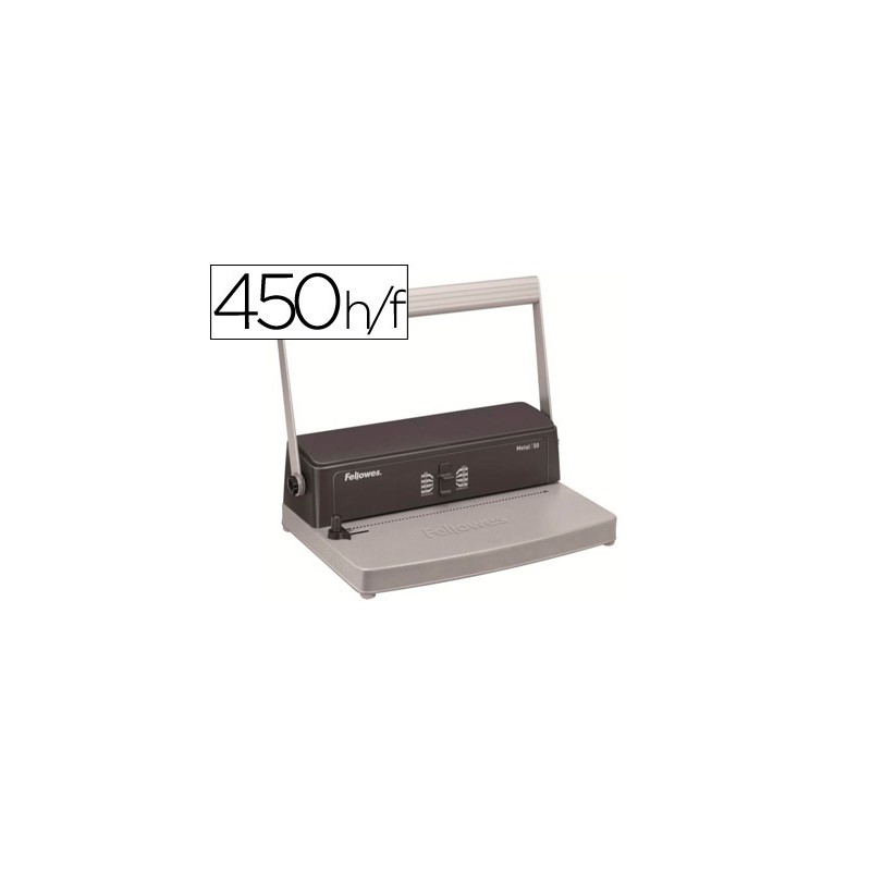 Encuadernadora manual de espiral metálico. Perfora hasta 10 hojas A4 de 80 g y encuaderna hasta 450 hojas A4 de 80 gr con un espiral de 50 mm. Paso del espiral 5:1. Palanca de perforación metálica, regulación del margen lateral y bandeja para residuos de fácil extracción. Incluye alicates para cortar el espiral.