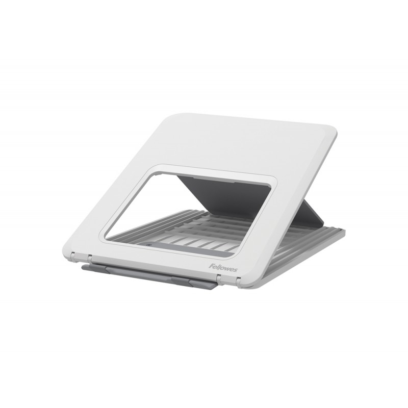 Soporte portátil con 12 ajustes de altura con elevación frontal única para proporcionar altura adicional. Diseño compacto, liviano y portátil. Admite portátiles de hasta 15” con un peso de hasta 4 kg. Diseño moderno. Fabricado con materiales 100 % reciclables y duraderos con una garantía extendida de 5 años. Dimensiones (An x Pro x Al): 280 x 250 x 20 mm. Peso 430 gr. Color blanco.