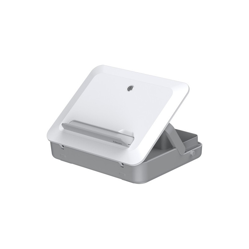 Maletín y Soporte elevador para portátil 2 en 1: permite colocar el portátil a la altura adecuada y guardarlo en su interior o poder transportarlo cuando no está en uso. 5 Configuraciones de altura. Diseño con estuche rígido compacto y ultraligero. Capacidad para portátiles de 14”, cargador y otros utensilios habituales. Asa integrada y correa de transporte extraíble. Fabricado con materiales 100% reciclables y duraderos, con garantía extendida de 5 años. Dimensiones (AnxProxAl): 38,7 x 29,8 x 8,7 cm. Peso 1,7 kg. Color blanco.