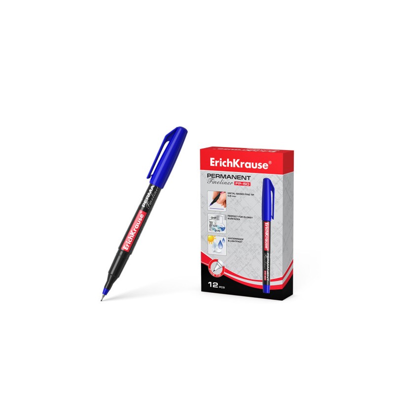 Marcador permanente universal. Adecuado para escribir en cualquier superficie, incluso discos CD/DVD, laminas de transparencias. Tiene el cuerpo de forma redonda y tapa con clip del color de la tinta. La punta fina en forma de aguja Fine tip esta reforzada con una base de metal. El ancho de escritura es de 0.6 mm. Las tintas a base de alcohol son resistentes a la luz y el agua. No son toxicas. No contienen xileno, tolueno.
