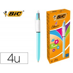 Bolígrafo retráctil 4 en 1. Con 4 colores fantasía: azul cielo, verde manzana, rosa y morado. Permite corregir, marcar o diferenciar un texto con sólo pulsar el color de tinta elegido. Sistema para correa. Cuerpo y clip de plástico. Punta media 1 mm. Trazo: 0,4 mm.