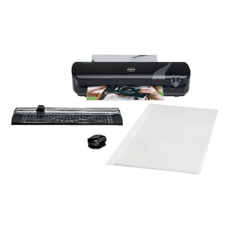 Plastificadora Inspire+ A4, ligera y compacta, para usuario doméstico y profesional ocasional con necesidades básicas. Ancho de entrada: 241 mm. Sistema 2 rodillos calientes. 4 minutos de precalentamiento. Velocidad 250 mm/min. Palanca de liberación de atascos. Admite hasta carteras 125 micras. Selector temperatura: frio / Caliente. Indicador led de enchufado (rojo) y máquina lista (verde). Admites carteras de plastificar tamaño A4 e inferiores. Bandeja de salida para acabado plano. Incluye started kit con una cizalla A4 para recortar plastico sobrante de las plastificaciones y papel (hasta 5 hojas a la vez) + accesorio para recortar y redondear esquinas de las fundas de plastificar + 5 carteras de plastificar de 75 micras. Tamaño 350 x 130 x 60 mm. Peso 1,39 kg. Color negro