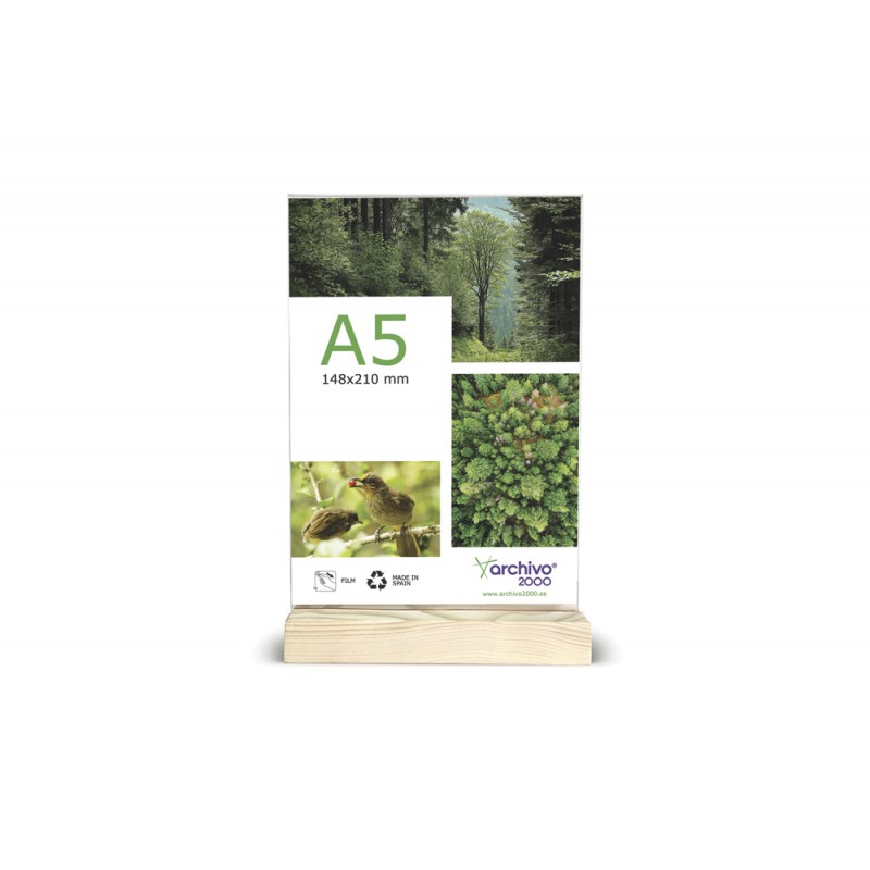 Expositor de sobremesa sostenible Green Display Archivo 2000 con base de madera. Formato DIN A5 vertical.. Fabricado en metacrilato 100% reciclado y reciclable ultra transparente resistente y base de madera. Base con acabado lijado y canal pasante, ranura anticaída adaptada a cada formato para una mayor seguridad del documento. Color cristal transparente y madera. Color cristal transparente y madera. Color cristal transparente y madera.