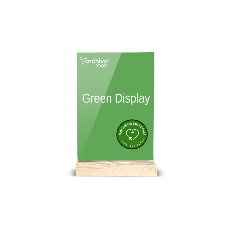 Expositor de sobremesa sostenible Green Display Archivo 2000 con base de madera. Formato DIN A4 vertical. Fabricado en metacrilato 100% reciclado y reciclable ultra transparente resistente y base de madera. Color cristal transparente y madera. Tamaño de la madera 40x210x30 mm .Medidas exteriores: 40x210x330 mm. Base con acabado lijado y canal pasante, ranura anticaída adaptada a cada formato para una mayor seguridad del documento. Fabricado en España.
