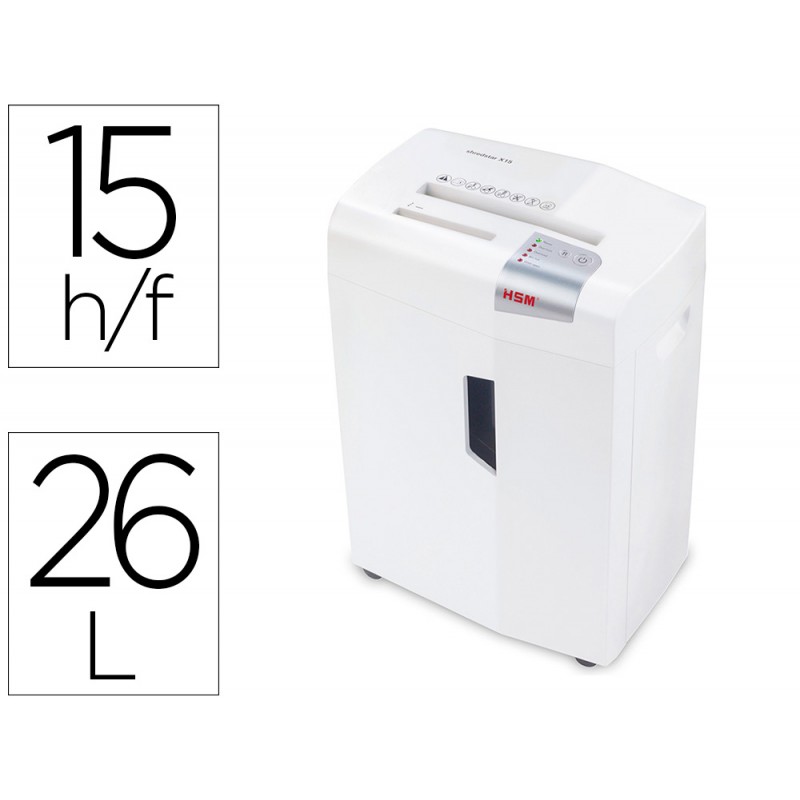 Destructora silenciosa y potente, el modelo estrella de la marca. Capacidad de corte: 15 hojas en partículas de 4 x 37 mm. Nivel de seguridad P-4. Destruye grapas, CD, clips y tarjetas de crédito. Mecanismo de corte independiente para CD. Función antiatasco de papel. Indicador de nivel de llenado. Panel de mando intuitivo. Inicio/paro automático con célula fotoeléctrica. Vaciado fácil. Ancho de entrada: 230 mm. Papelera de 26 litros. Medidas: 390 x 300 x 595 mm. Peso: 13 kg.