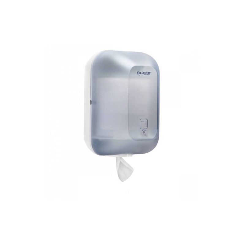 DISPENSADOR BOBINA L-ONE MAXI LUCART. Dispensador de papel para bobinas de mecha. Ideal para las zonas de trabajo y la cocina del sector Hostelería y Restauración. Garantía de Higiene y control de consumos. Viene equipado con cerradura con llave para una mayor seguridad y evitar la sustracción del papel.
