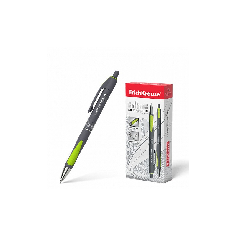 Lapiz mecanico con punta de metal y boquilla retractil. El lapiz mecanico tiene una carcasa redonda y brillante con una zona de agarre ergonomica, equipada con dos bordes de goma en colores neon. Dureza HB. Minas de 0.5 mm de diametro. El modelo MEGAPOLIS…