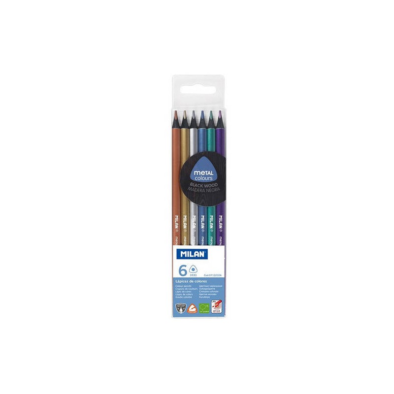 Lápices de colores metalizados con madera de tilo en color negro. Mina de 2,9 mm Ø. Forma triangular ergonómica. La mina ofrece un trazo uniforme y es resistente a la rotura, gracias al sistema LPS (Lead Protection System) que protege la mina gracias a su adhesión con la madera. Madera procedente de plantaciones sostenibles. 6 colores metalizados: cobre, oro, plata, azul, verde, lila. Colores con nombre propio: Planet Copper, Solar Gold, Satellite Silver, Galaxy Blue, Boreal Green, Cosmos Purple.