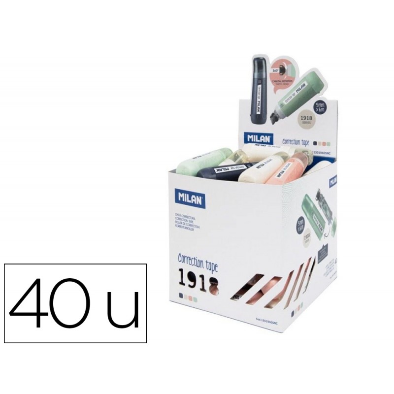 Cinta correctora en seco. Cilíndrica. Apta para zurdos gracias a la rotación de 360º de su punta. Rápida, limpia y precisa. Correcciones sobre todo tipo de papel, no deja marcas en fotocopias o fax. 5 mm de ancho x 6 m de largo. Colores surtidos: amarillo, azul, naranja y turquesa.