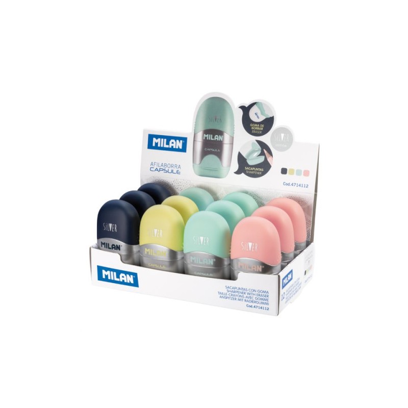 Combinación de goma de borrar y sacapuntas con depósito. Diseño CAPSULE serie Silver. El sacapuntas dispone de una cuchilla de acero afilada y resistente, ideal para todo tipo de lápices. Sacapuntas con cuchilla de seguridad: este sistema evita que se pueda separar la hoja del cuerpo del sacapuntas. Diseño original creado por el propio departamento de I+D de MILAN. Colores surtidos disponibles: 2 amarillo, 3 azul marino, 3 rosa y 4 turquesa. Gomas de borrar de recambio disponibles.