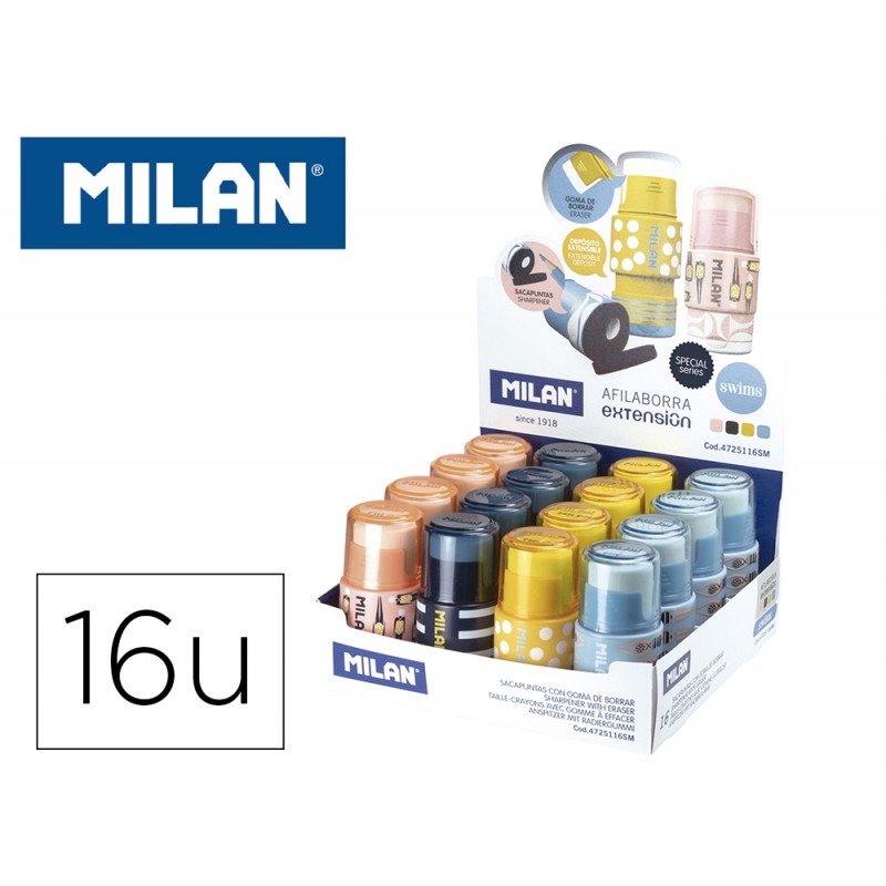 Combinación de goma de borrar y sacapuntas con depósito. Diseño EXTENSION, serie especial Swims. Goma suave de caucho sintético flexible. El sacapuntas dispone de una cuchilla de acero afilada y resistente, ideal para todo tipo de lápices. Sacapuntas con cuchilla de seguridad: este sistema evita que se pueda separar la hoja del cuerpo del sacapuntas. Depósito extensible. Diseño original creado por el departamento de I+D de MILAN. Contiene 5 unidades de color rosa, 5 azul claro, 3 amarillo y 3 azul marino.