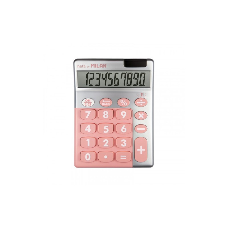 Calculadoras de sobremesa de 10 dígitos y teclas grandes. Tecla de rectificación de entrada de datos. Alimentación dual: célula solar y pila de 1,5 V. Apagado automático. Medidas calculadora: 14,5 x 10,6 x 2,1 cm. Edición SILVER. Caja expositora con 4 colores surtidos: rosa, azul marino, turquesa y amarillo.