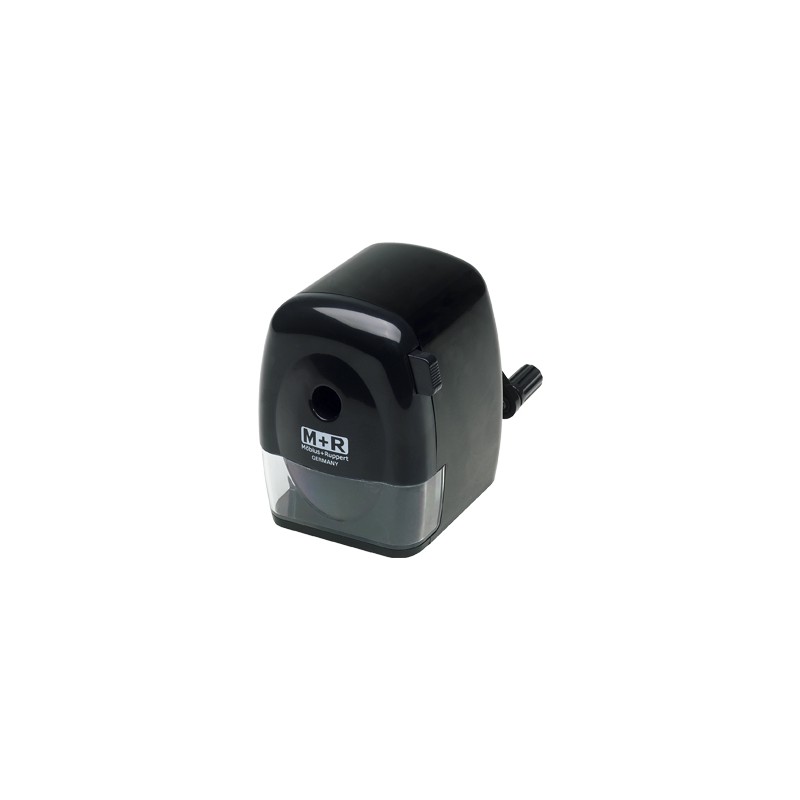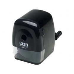 Sacapuntas metálico y cobertura de plástico. De sobremesa, incluye agarre para su sujeción. Manual con manivela y abrazadera que evita la rotura del lápiz. Función de parada automática cuando la punta está suficientemente afilada. Permite selección del diámetro del lápiz. Disponible en color negro y en color rojo. Un uso. Medidas: 71 x 110 x 95 mm.