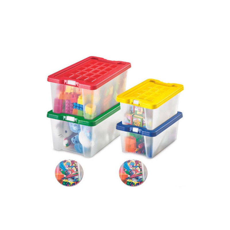 Caja con asas integradas en la tapa para conferirles una mayor resistencia. Con tratamiento en la superficie de la base que otorga una mayor resistencia al rayado, con transparencia en una de las caras para visualizar mejor el contenido. Con capacidad de hasta 9,2 litros. Tapas en colores surtidos.